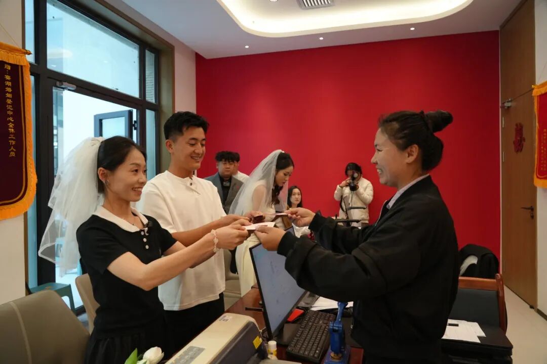 圖源:成都天府政務 “婚登+旅行”成為年輕人喜愛的模式之一,新人們提前選定一個目的地,在旅行的同時舉辦婚姻登記儀式。 高258米的環球港52層,是今年上海普陀區打造的“云端”婚姻登記點。登記點內為新人提供登記全流程服務;而向外遠眺,上海城市天際線一覽無余,浪漫又別致。 “在這既能見證愛情,還能出片,儀式感和存在感都直接‘拉滿’。”上海普陀區婚姻收養登記中心副主任歸燕飛介紹,“云端”婚姻登記點每月限時開放,如果是大家認為的“好日子”,預約名額幾乎“秒光”。 融合婚慶典禮和旅行、文化體驗等為一體,“婚旅”正讓新人找到屬于自己的浪漫節奏,也帶動多地“婚旅經濟”火熱出圈。 “紅本本”變身浪漫“通行證” 記者采訪了解到,“婚旅熱”離不開政策賦能,也得益于多地得天獨厚的資源稟賦和產業鏈的協同發力。 “寵新人”,政策送“禮包”—— “領證”,也可以是一種打卡體驗。在大理州大理市喜洲鎮海舌半島婚姻登記點,1314米的步道象征往后余生每一步都能攜手共度,520米的花道則寓意新人每一步都能花團錦簇,兼具儀式感和浪漫氛圍,吸引不少新人在這里結婚登記。 “全國通辦”政策助推旅行結婚、目的地婚禮的熱潮。5月10日以來,云南麗江市婚姻登記中跨區域和跨省的數量大幅增長。10月15日,新疆賽里木湖景區婚姻登記中心累計領證新人超過1萬對。 各地也以結婚登記“全國通辦”政策為契機,開展一系列“寵新人”活動: