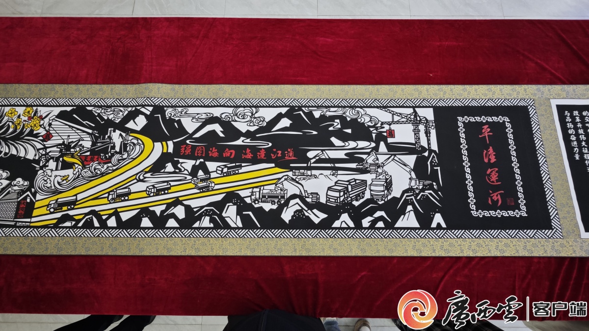 展出現場。通訊員 梁志偉 攝 平陸運河是新中國成立以來第一條貫通西江流域與北部灣的運河工程,也是西部陸海新通道的骨干工程和廣西迄今規模最大的水運項目。這幅剪紙長卷以中國傳統剪紙技藝生動刻畫了平陸運河從起點平塘江口至出海口的全線景觀。長卷中不僅呈現了運河建設中船舶通航、機械施工等現代工程場景,也融入了沿線城鎮風貌、田園風光與民族人文元素,實現了歷史與現代、工程與藝術的有機融合。