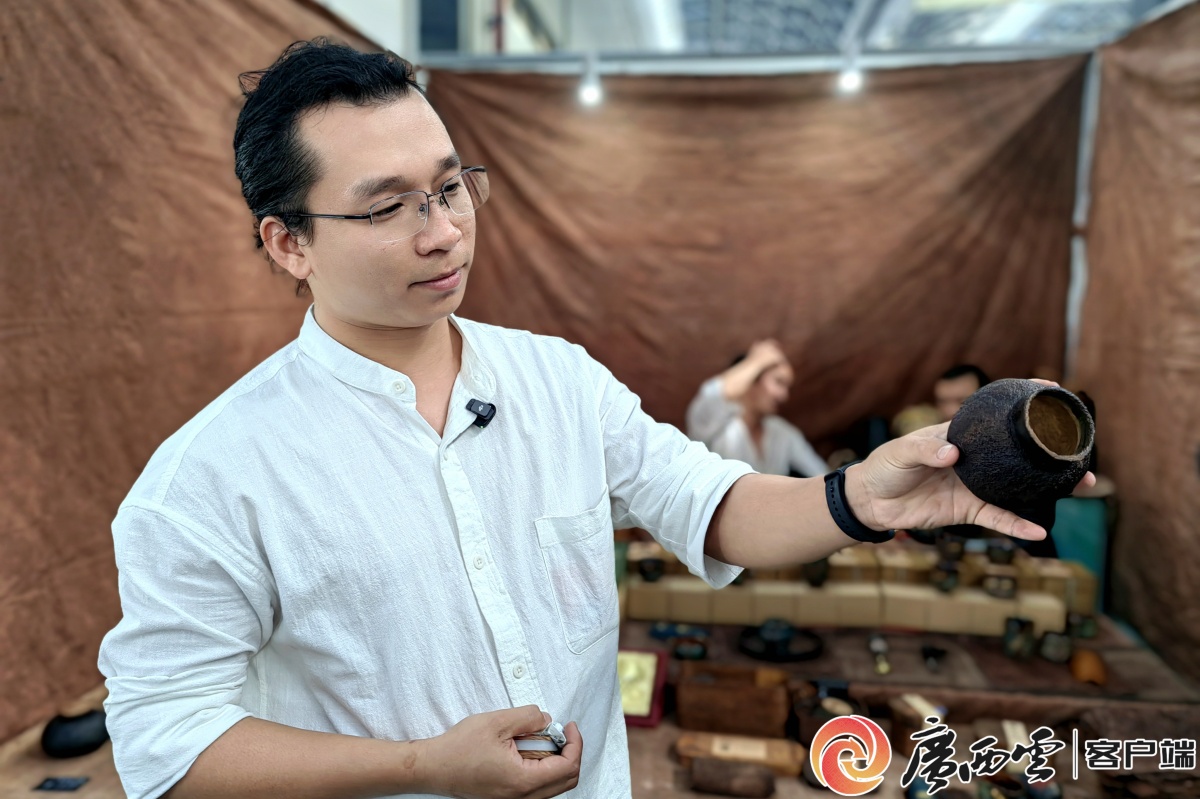 桂林漆器傳承人勞傳勝向觀眾介紹柚罐。 一路向前,29名鄉(xiāng)村工匠齊上陣,涵蓋刺繡印染、六堡茶制作、瑤藥制作、壯錦紡織等。 今年,自治區(qū)鄉(xiāng)村振興干部教育培訓(xùn)中心首次組織廣西鄉(xiāng)村工匠推介展區(qū)亮相廣西國際農(nóng)業(yè)博覽會,成為展會一抹亮色。