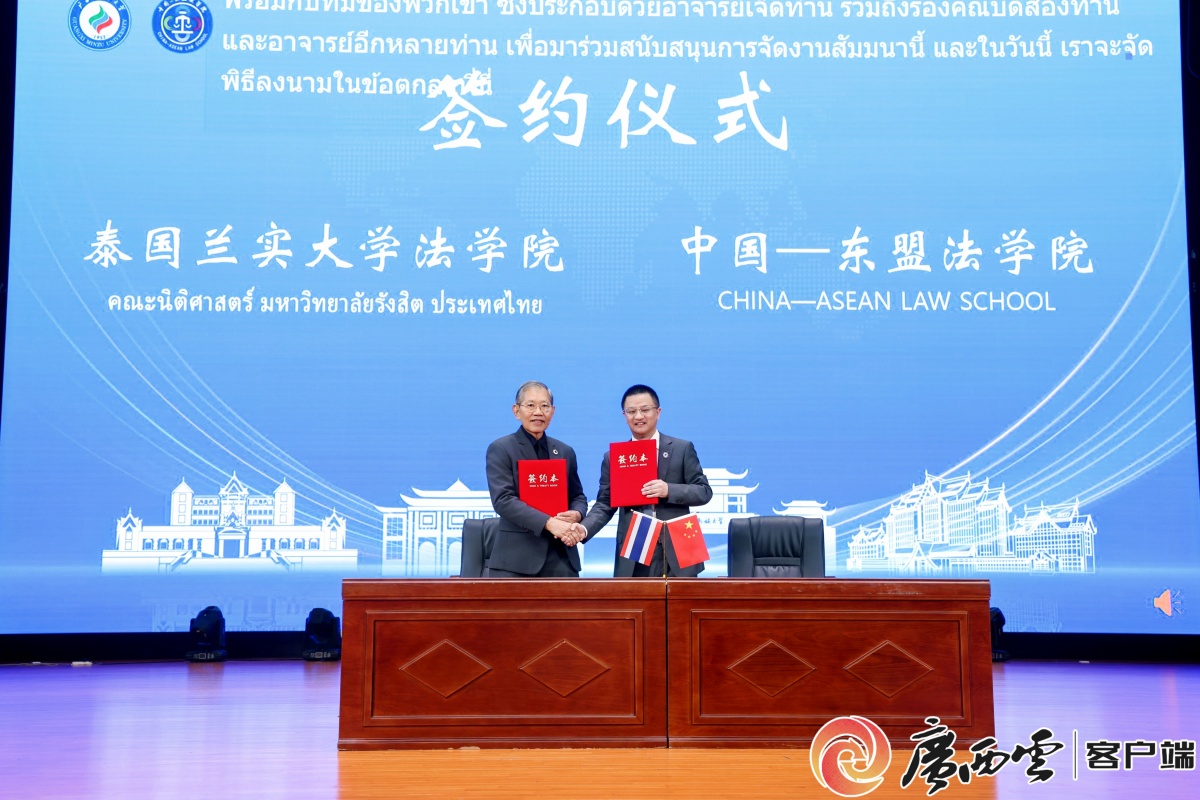 簽約儀式現(xiàn)場。 在研討環(huán)節(jié),中泰專家學(xué)者圍繞法治合作、泰國法律制度、知識產(chǎn)權(quán)協(xié)調(diào)等議題展開深入交流。在法治人才培養(yǎng)專題中,多所高校代表分享了“法學(xué)+東盟語種+實務(wù)”的創(chuàng)新模式與實踐經(jīng)驗,共同探索涉外法治人才協(xié)同培養(yǎng)新路徑。 |