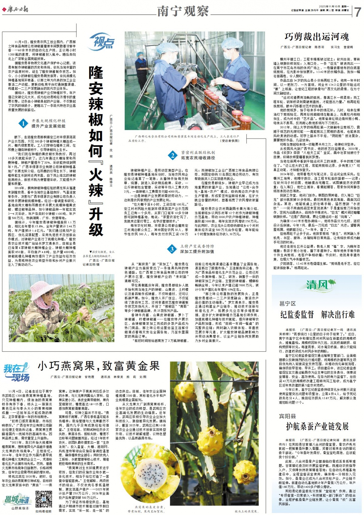 今日刊發的廣西日報南寧觀察版頭條,關注隆安縣辣椒產業發展。 11月4日,隆安縣農民工創業園內,廣西那之味食品有限公司辣椒醬灌裝車間飄散著濃郁辛香——60余米長的自動化生產線,正以每小時1200瓶的速度,將辣椒醬封入瓶中。隨后奔向北上廣深等全國商超貨架。