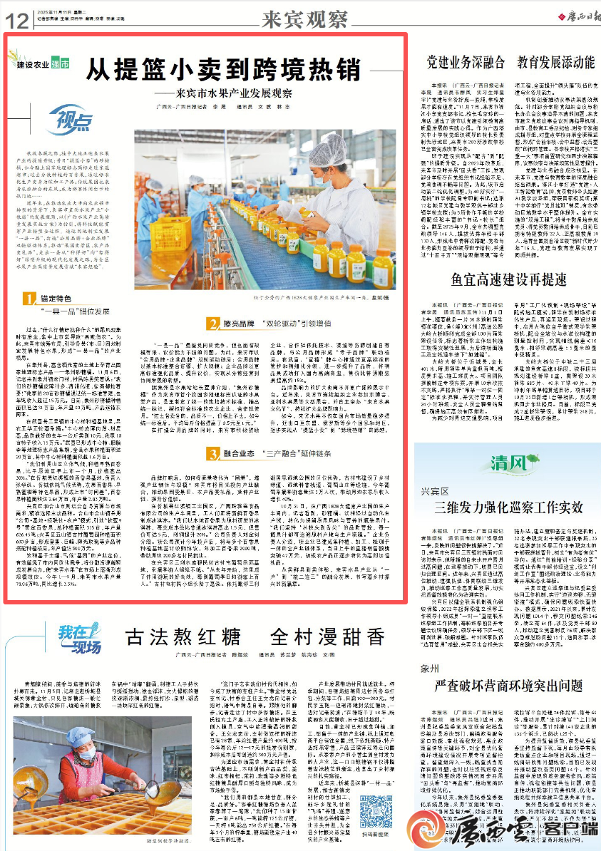 廣西日報版面。 秋收冬藏之際,桂中大地正迎來水果產業的提質升級:昔日“提籃小賣”的砂糖橘,如今貼上國家地理標志商標走進東盟超市;過去分散種植的百香果,通過標準化生產變身為深加工產品;傳統果園也乘著農旅融合的東風,成為游客休閑打卡的熱門地…… 近年來,在推動農業大市向農業強市轉型的背景下,來賓市直面水果產業“小散弱”的發展瓶頸,以《廣西水果產業高質量發展實施方案》為指引,將科技賦能貫穿產業轉型全過程。通過因地制宜發展“一縣一品”,打造“公用品牌+企業品牌”雙輪驅動體系,推動“果園變景區、農產品變禮品”,走出一條從“種得好”向“賣得好”轉型升級的現代化發展之路,為全區水果產業高質量發展貢獻“來賓經驗”。 錨定特色 “一縣一品”錯位發展 過去,“什么行情好就種什么”的跟風現象時有發生,集中上市常導致“果賤傷農”。為此,來賓市統籌布局,引導各縣(市、區)因地制宜發展特色水果,形成“一縣一品”的產業格局。
