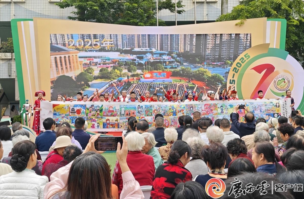 南寧市民主路小學舉行建校七十周年慶祝活動。記者 李香瑩 實習生 王思 攝制 七十載櫛風沐雨,七秩薪火相傳。11月11日,南寧市民主路小學以“七秩正芳華・同心向未來——薪火相傳七十載・砥礪奮進譜新篇”為主題,舉行建校七十周年慶祝活動。 步入校門,退休教師、校友們在“時光簽名墻”上留下筆跡,在參觀科創藝術展、領取紀念信箋的過程中,重溫歲月溫情。人群中,一群銀發長者格外引人注目——他們是南寧市民主路小學的首屆學子。“感謝母校培養,愿母校越來越好。”首屆學子唐永平簡單的話語,道出無數校友共同的心聲。