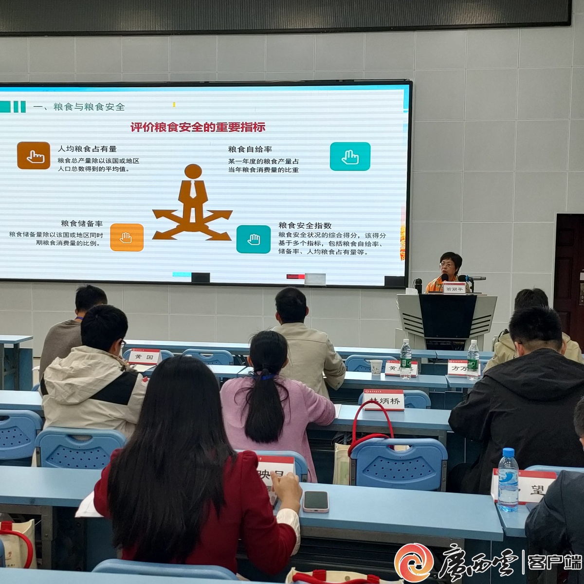 開班儀式現場。 培訓班緊扣糧食安全核心主題,采用“理論授課+實踐教學+技能實訓”模式精心設計培訓課程。理論課程涵蓋習近平總書記關于“三農”工作重要論述、鄉村振興政策法規、糧食安全與耕地保護等內容。自治區農業農村廳二級巡視員翁麗平就糧食安全與耕地種植用途管控開展專題教學,南寧師范大學副校長王國紅教授、廣西農業職業技術大學黨委副書記陳信存教授等專家學者,分別從鄉村振興戰略實施、農耕文化傳承等角度授課,引導學員厚植愛農情懷,強化興農擔當。