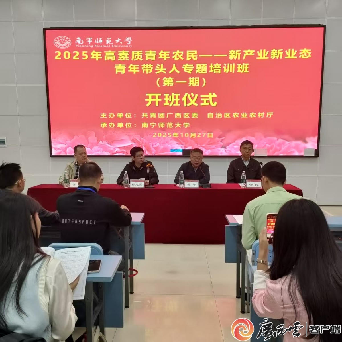 10月26日至11月8日,由共青團廣西區委、自治區農業農村廳主辦,南寧師范大學承辦的2025年高素質青年農民——新產業新業態青年帶頭人專題培訓班分兩期在南寧師范大學明秀校區舉辦。自治區農業農村廳農村社會事業促進處處長龔平、共青團廣西區委青年發展部副部長彭志榮、自治區農業農村廳正高級工程師朱光書、南寧師范大學繼續教育學院院長徐健出席開班儀式。來自全區的100名農村青年致富帶頭人、青年家庭農場經營者、農民合作社帶頭人及返鄉大學生參訓,每期培訓7天。