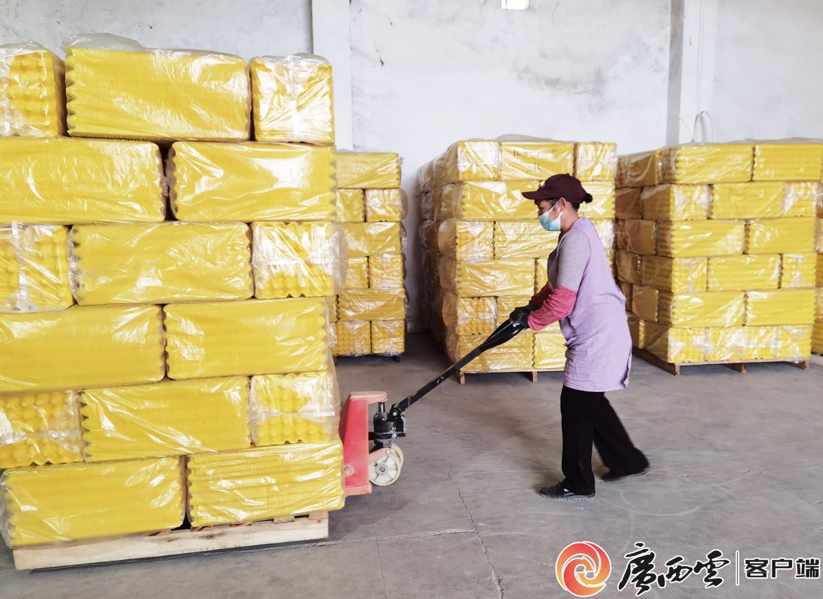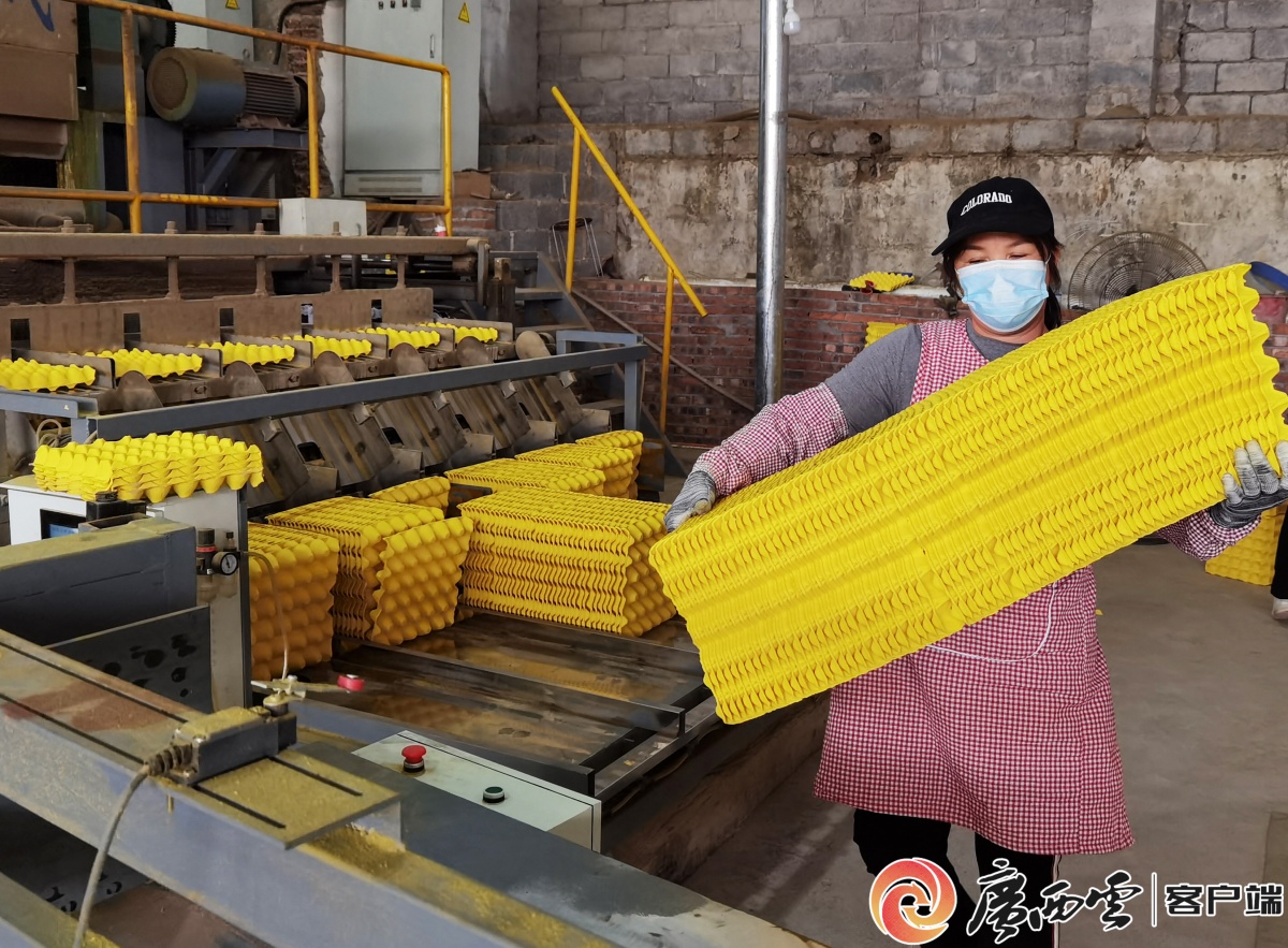 員工搬運已制作完成的蛋托。 “馬坪鎮的交通便利,營商環境非常好,我們是從柳州過來投資的,政府對我們的支持既實在又全面,在人才招聘,產業鏈上下游協同,給了很多引導,幫我們少走彎路。”談及在馬坪鎮的發展歷程,文鐘昊對當地的營商環境贊不絕口。 正是在這樣的營商環境加持下,吉奧包裝紙制品有限公司得以快速扎根、穩步發展。“我們吉奧包裝紙制品有限公司2021年在馬坪建廠,是專門生產紙質雞蛋托的廠家,現在擁有兩條生產線,在崗員工40名,日產量35萬片蛋托,主要供應兩廣地區及周邊的貴州云南湖南等地。”