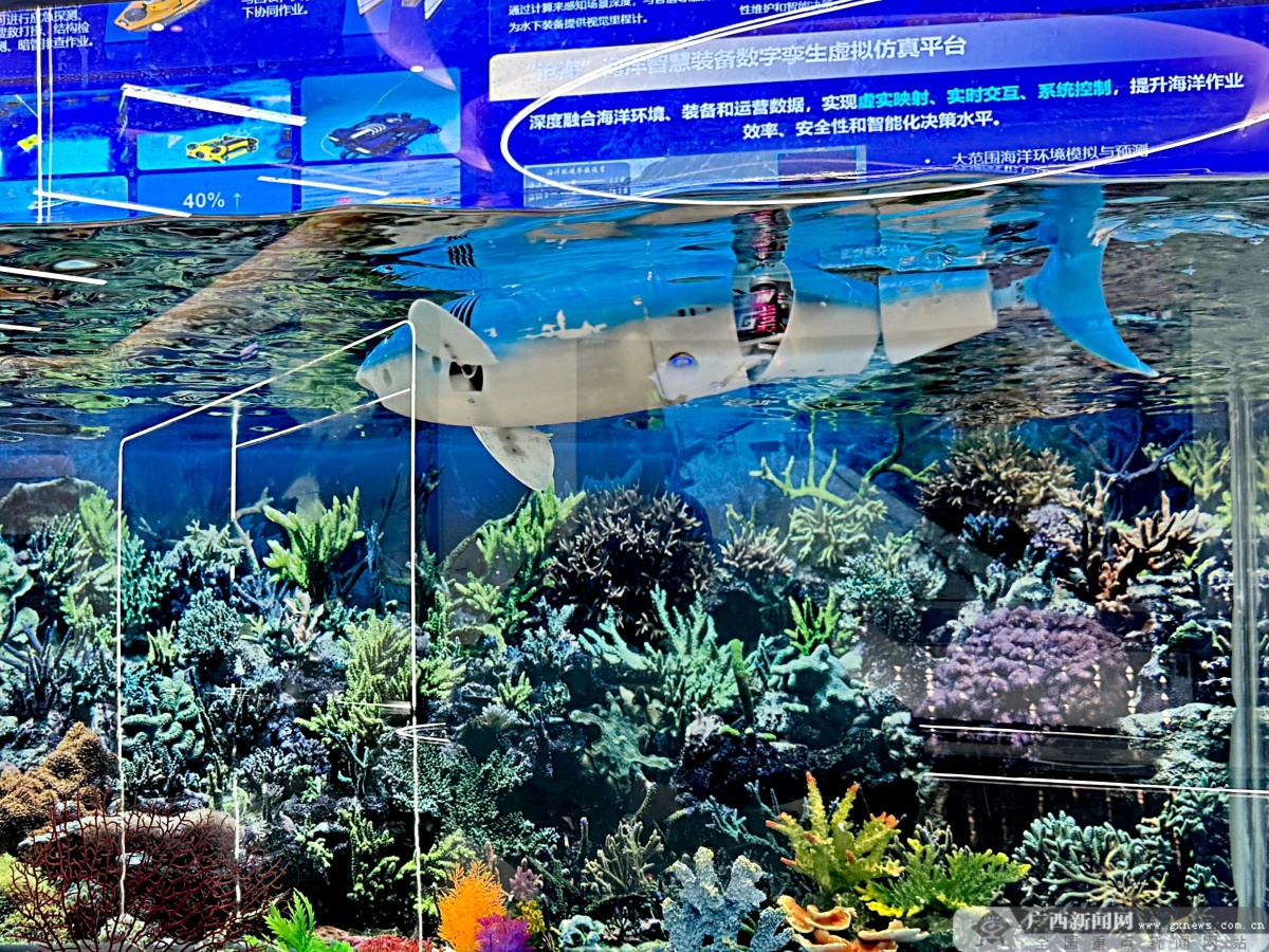 靈動的仿生機器魚在水中穿梭。南A中心供圖 靈動的仿生機器魚在水中穿梭,能輕松承擔水文監測任務;廣西創新研發的全國首個反詐大模型,未來將與東盟共享技術、共防跨境電信詐騙……11月10日,記者走進南A中心展示中心一樓的產業與應用區,感受AI技術的創新風采。