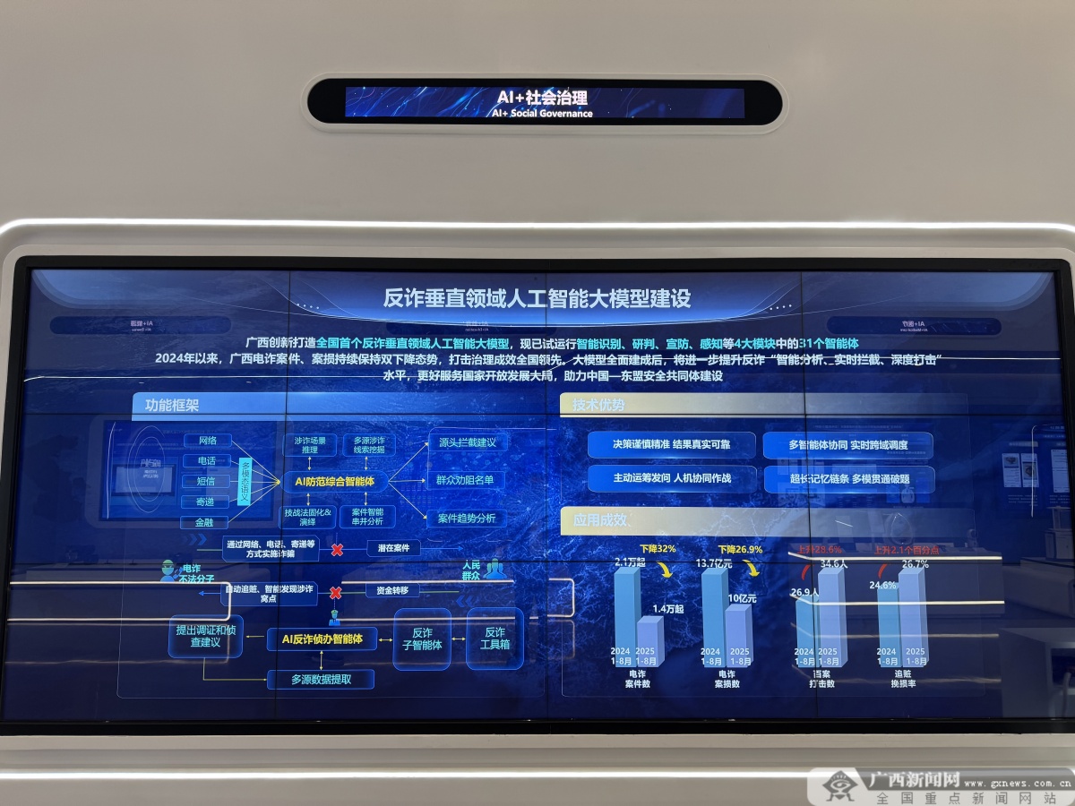 廣西創新研發的全國首個反詐大模型。南A中心供圖 “展示中心完整呈現人工智能生態全產業鏈,涵蓋硬件、大模型及智能體等領域。”南寧市政府參事、廣西南一智能科技有限公司首席科學家郭沙自豪地介紹,目前全國鮮有其他展示中心在完整性上可與之比擬。