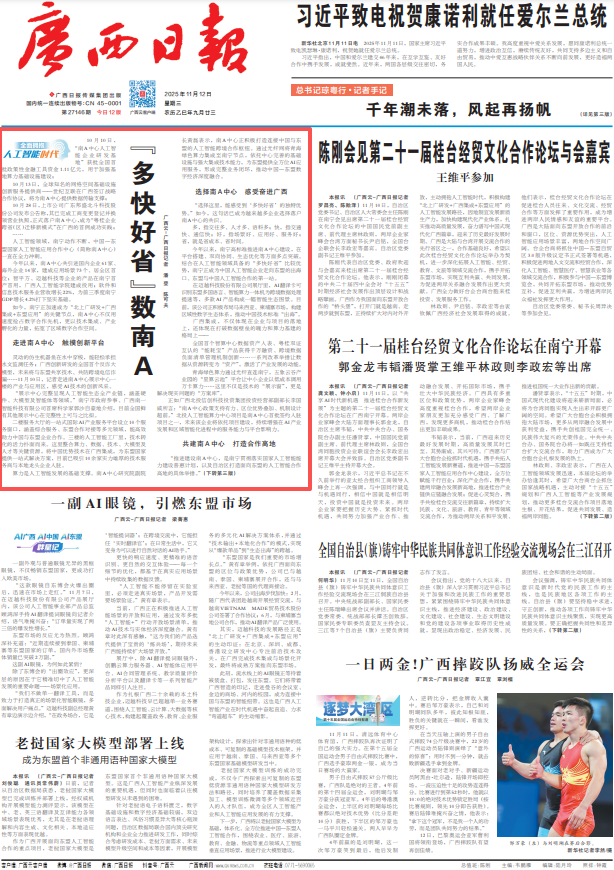 南A中心展示中心服務大廳。記者 周軍 攝 二樓服務大廳的一站式國際AI產業服務平臺設立10個服務窗口,涵蓋綜合服務、東盟合作對接等多元領域,能高效助力中國與東盟企業合作。三樓的人工智能工廠里,技術轉化的活力撲面而來。這里整合算力、數據、技術、大模型及人才等關鍵資源,將中國優勢技術在廣西集成,為東盟國家提供一站式解決方案,目前已吸引10余家實力雄厚的技術服務商與本地龍頭企業入駐。 算力是人工智能發展的基礎支撐。南A中心研究院副院長黃磊表示,南A中心正積極打造連接中國與東盟的人工智能跨境合作樞紐。通過光纖網將青海綠色算力集成至南寧節點,依托中心完善的基礎設施與強大集成技術能力,為東盟提供全方位AI應用服務,形成完整業務閉環,推動中國—東盟數字經濟深度融合。 選擇南A中心 感受奮進廣西 “選擇這里,能感受到‘多快好省’的獨特優勢。”如今,這句話已成為越來越多企業選擇落戶南A中心的共識。 多,指交往多、人才多、語料多;快,指交通快、通信快;好,指場景好、應用好、服務好;省,就是省成本、省時間。 今年以來,南寧高標準推進南A中心建設,在平臺搭建、雙向協同、生態優化等方面多點突破。結合在人工智能領域具備的“多快好省”比較優勢,南寧正成為中國人工智能企業走向東盟的出海口、東盟與中國人工智能合作的第一站。 在邁越科技股份有限公司展廳里,AI翻譯卡可識別東盟多國語言、智能算力一體機為跨境數據處理提速等,多款AI產品構成一幅智能生態圖景。目前,該公司正積極布局馬來西亞、柬埔寨市場,構建區域性數字生態體系,推動中國技術標準“出海”。 廣西集成,不僅體現在企業與項目的落地上,還體現在打破數據壁壘的魄力和算力基建的格局上—— 全國首個智算中心數據資產入表、粵桂雙證互認的“能耗寶”產品獲得千萬融資、跨境數據負面清單管理機制創新……一系列改革舉措讓數據從資源轉變為“資產”,激活了產業發展的動能。 青海綠色算力通過光纖直連南寧,五象云谷產業園的“星算云池”平臺讓中小企業以低成本調用萬卡算力……這里不僅是技術的“展示窗”,更是解決現實問題的“方案庫”。 正如廣西北投信創科技投資集團投資經營部副部長李國威所言:“南A中心政策支持有力、區位優勢疊加、機制設計超前。”北投人工智能算力中心項目是南A中心首批簽約入駐項目之一,未來該企業將依托項目建設,持續增強在AI產業發展和區域智能化進程中的服務能力與平臺影響力。 共建南A中心 打造合作高地 “推進建設南A中心,是南寧貫徹落實國家人工智能能力建設普惠計劃,以及自治區打造面向東盟的人工智能合作高地的具體舉措。”在日前南寧市召開的“加快建設面向東盟開放合作的國際化大都市,服務打造面向東盟的人工智能合作高地”新聞發布會上,發言人介紹了該市提出的發展目標,點明了南A中心的戰略意義。 持續強化平臺功能,促進資源集聚。南寧圍繞“國家所需、廣西所能、東盟所盼”,將南A中心打造成為中國—東盟人工智能應用合作的公共服務門戶、交流展示窗口、運營管理中樞和資本賦能平臺。第22屆東博會期間,南A中心促成新簽署產業合作項目24個,覆蓋智慧物流、農業、文旅、電競和人才培訓等多個領域。 持續推動雙向對接,實現協同發展。南寧積極構建“一節點兩板塊多中心”的開放架構,在國內重點城市和東盟國家設立中心,目前已落地老撾海外中心。截至目前,發布了54項“人工智能+”機會清單和84項海外人工智能應用場景需求,征集案例450多項。 持續優化開放生態,增強輻射能力。南寧積極打造市場化、法治化、國際化營商環境,出臺支持南A中心建設專項政策22條,吸引文萊、印尼、老撾、緬甸、泰國、越南等多國企業入駐。 “這里把未來科技和東盟文化融合在一起,太奇妙了!”近日,老撾萬象時報記者張金權參觀南A中心后忍不住贊嘆,這不僅是技術輸出,更是共建共贏的數字生態。 下一步,該市將全力提速人工智能發展,強化基礎建設,加快可信數據專區建設,確保明年東博會期間投用;優化政策體系,加強企業培育,推動奇安信等新簽約項目盡快落地,力爭年內推動15家人工智能相關企業上規入統;拓展場景應用,結合制造業新型技改城市試點、中小企業數字化轉型試點城市建設,豐富“人工智能+”應用場景機會清單;推動南A中心分中心拓展業務,盡快形成標桿應用。