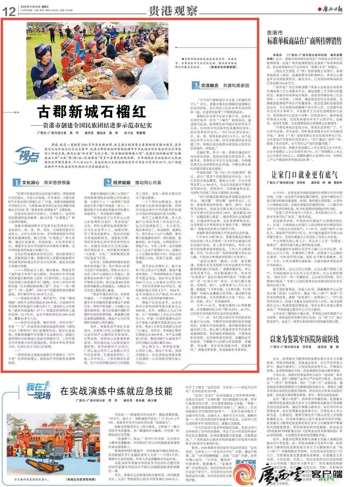 報紙版面。 貴港,既是一座擁有2200多年歷史的古郡,亦是西江經(jīng)濟帶上重要的現(xiàn)代港口城市,在中原文化與嶺南文化交流互鑒中,這座古郡新城始終堅持把鑄牢中華民族共同體意識作為全市各項工作的主線,傾力打造“和為貴”文化工程、“紅石榴培根鑄魂工程”、黨建引領(lǐng)網(wǎng)格治理“紅格善治工程”以及“商(協(xié))會+民族團結(jié)”等多個富有成效的品牌。全市涌現(xiàn)出自治區(qū)級以上民族團結(jié)進步模范集體、個人共168個,自治區(qū)級以上民族團結(jié)進步示范區(qū)示范單位49個,為廣西建設(shè)鑄牢中華民族共同體意識示范區(qū)賦能助力。 文化潤心 筑牢思想根基 “紀(jì)律不僅是校園生活的基本要求,更是愛國行為的起點。只有心中有規(guī)、行中有紀(jì),才能在新時代中真正踐行愛國之志。”日前,貴港市荷城初級中學(xué)報告廳內(nèi),八年級400多名師生正在認(rèn)真聆聽政教處主任馮仁周“青春有規(guī)·愛國有為”主題宣講。 這是該校堅持為黨育人、為國育才,全面深化民族團結(jié)進步教育,傾力打造“紅荷蓮心”育人品牌的縮影。 貴港市荷城初級中學(xué)黨委書記李洪涌介紹,全校有壯、瑤、苗、侗、布依、毛南等民族學(xué)生3875人,占學(xué)生總數(shù)33.5%。學(xué)校聚焦構(gòu)筑中華民族共有精神家園,傾力打造“紅荷蓮心”育人品牌,通過紅色教育、實踐體驗、文化傳承等方式,增強學(xué)生對中華民族的認(rèn)同感和自豪感,讓中華民族共同體意識深植于心。