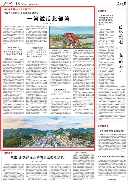《人民日報》(2025年11月12日 第18版)版面截圖 祖國西南,北部灣畔,一條世界級運河正在八桂大地穿山破嶺。 2022年8月開工以來,歷經3年多建設,平陸運河雄姿初現:自廣西南寧平塘江口順流而下,沿欽江入北部灣,134.2公里的航程上,航道基本成形、樞紐高高聳立,百米寬的河面上,河水靜靜流淌……