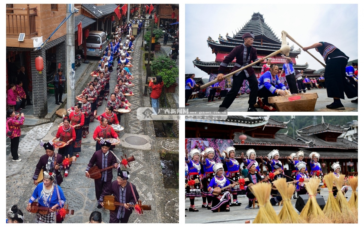 圖為活動現(xiàn)場。蘭堃 攝 11月8日 柳州市三江侗族自治縣林溪鎮(zhèn)美俗村 歡度第三屆紅糯米文化節(jié) 當(dāng)?shù)囟弊迦罕娚碇褡迨⒀b 以糯稻豐收巡游、文藝展演 美食品嘗、農(nóng)產(chǎn)品展銷 百家宴等豐富多彩的民俗活動 盡展侗寨農(nóng)耕文化和豐收成果 吸引湘黔各民族同胞和游客體驗觀賞 龍勝糯粑節(jié) 來源:桂林市融媒體中心 11月7日 桂林市龍勝各族自治縣平等鎮(zhèn) 舉行一年一度“糯粑節(jié)” 通過民俗巡游、原生態(tài)歌舞表演 打糍粑、彈唱琵琶歌 跳多耶等民俗活動 共享豐收喜悅 糯粑,既承載著人們對土地的感恩 對先祖的敬仰、對美好生活的期許 又是傳遞敬意、祝福的“最高禮行”