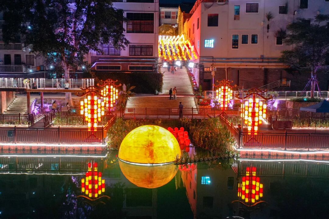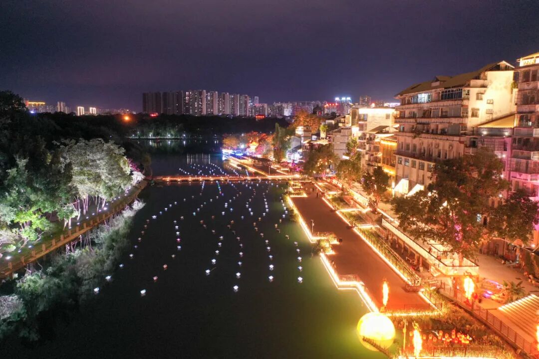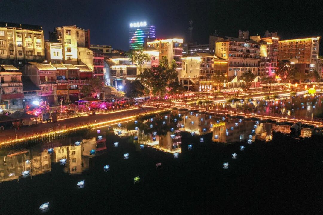 河邊西街的夜色。記者 梁力升 攝 河面上,多艘折紙狀的小浮船整齊排列,配合上接點成片的燈光,仿佛復刻了當年在百色三江口一帶,往來船只絡繹不絕的繁華景象。 “這個‘圓月’是一個發光裝置,河道上浮船的圖案多為壯錦、跳躍的螞拐等壯族文化元素,我們的目標是為游客打造沉浸式的煙火體驗區,這里將成為一個充滿活力的夜間生活打卡地。”歐靈丹說。