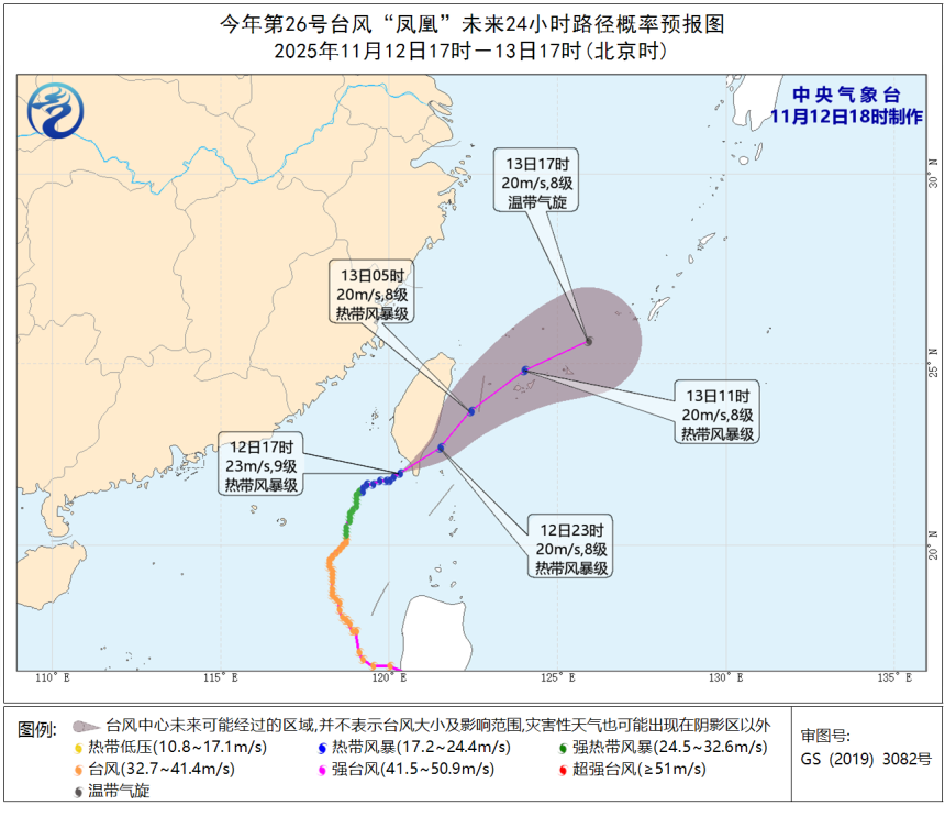 “鳳凰”于11月12日傍晚到夜間 在臺(tái)灣島南部沿海登陸或擦過 爾后逐漸變性為溫帶氣旋 受其影響 東南沿海的風(fēng)雨天氣會(huì)明顯增強(qiáng) 浙江等地將現(xiàn)大到暴雨 臺(tái)灣島也仍會(huì)持續(xù)強(qiáng)降雨