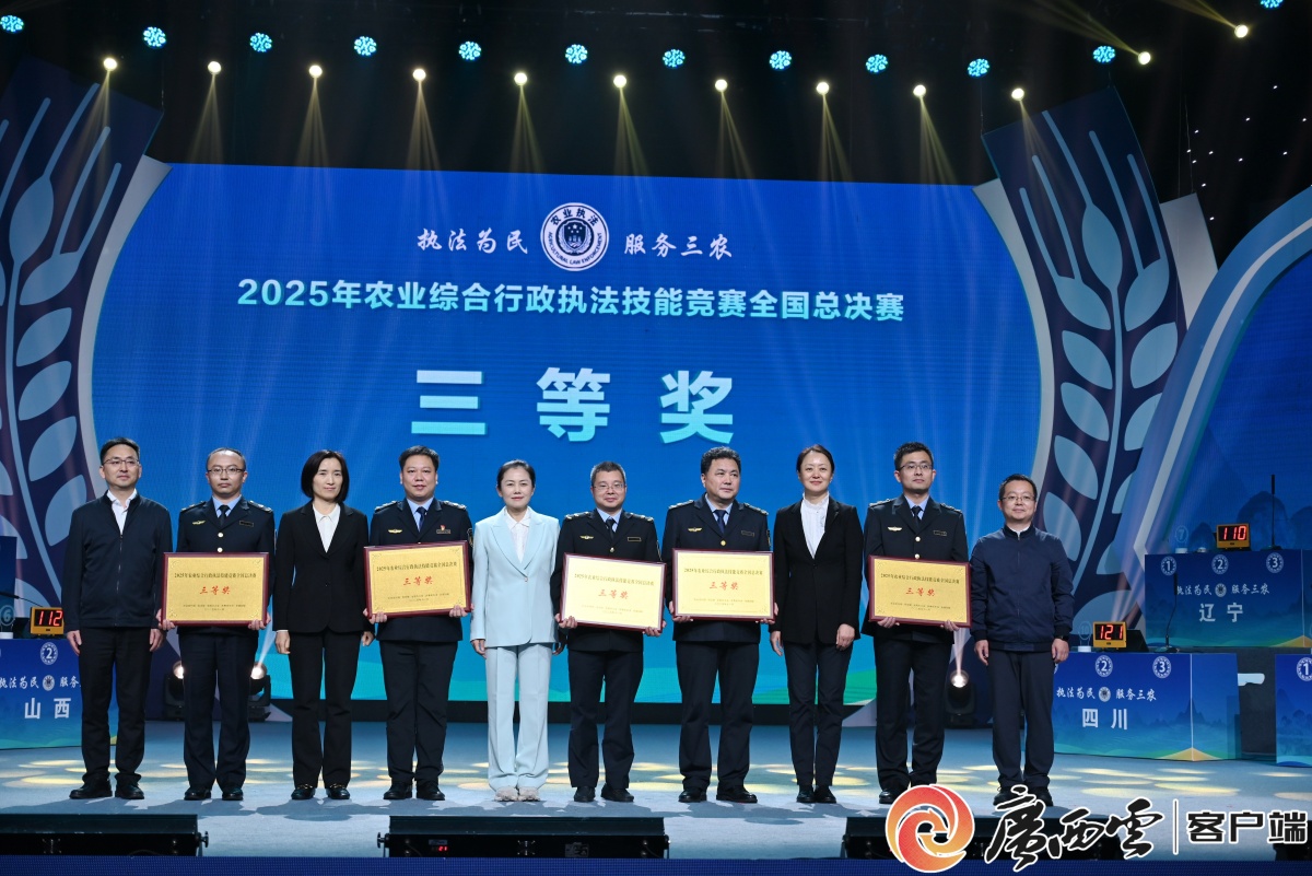 11月7日,農業農村部、司法部、全國總工會、共青團中央、全國婦聯聯合舉辦的2025年全國農業綜合行政執法技能競賽在南寧落幕,廣西代表隊首次進入決賽,并榮獲團體三等獎(全國第9名),實現廣西在這項全國性賽事團體獎“零的突破”。 本次競賽為期3天,匯集了全國32個省(自治區、直轄市、建設兵團)農業農村部門執法骨干,歷經模擬執法、閉卷考察、案卷糾錯、知識競答多輪激烈角逐。