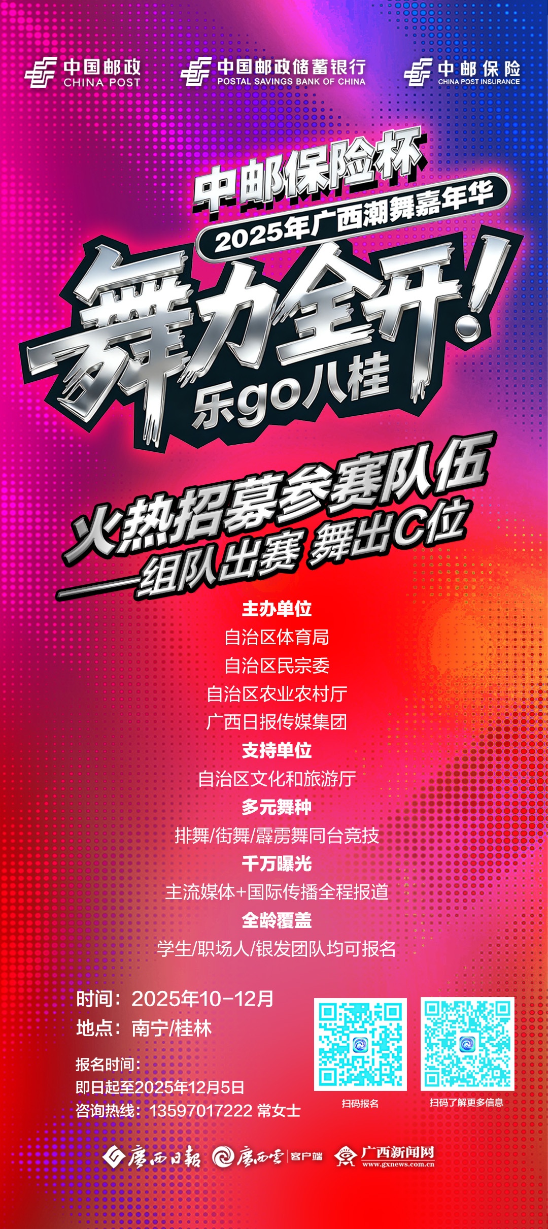 “中郵保險杯”2025年廣西潮舞嘉年華暨第四屆廣西排舞大賽火熱開啟!本屆大賽突破往屆規模,創新推出“潮舞推薦官”計劃,特邀來自體育、舞蹈、文化等領域的杰出代表跨界助陣。他們用最炫酷的方式詮釋潮舞魅力,帶領全民共赴這場融合民族風情與潮流文化的舞蹈盛宴! 在山水間起舞,在郵路上守護。當郵政綠遇見潮舞炫彩,會碰撞出怎樣的火花?中國郵政廣西區分公司李希跨界加入"潮舞推薦官",向全區舞者發出暖心邀約。“連接美好,無處不在。”讓我們跟隨她的視角,看郵政人如何為美好生活賦能! 我要報名 ↓↓↓ 本次報名采用網絡報名,各參賽隊掃描下方二維碼填寫報名信息。報名咨詢:常老師 13597017222