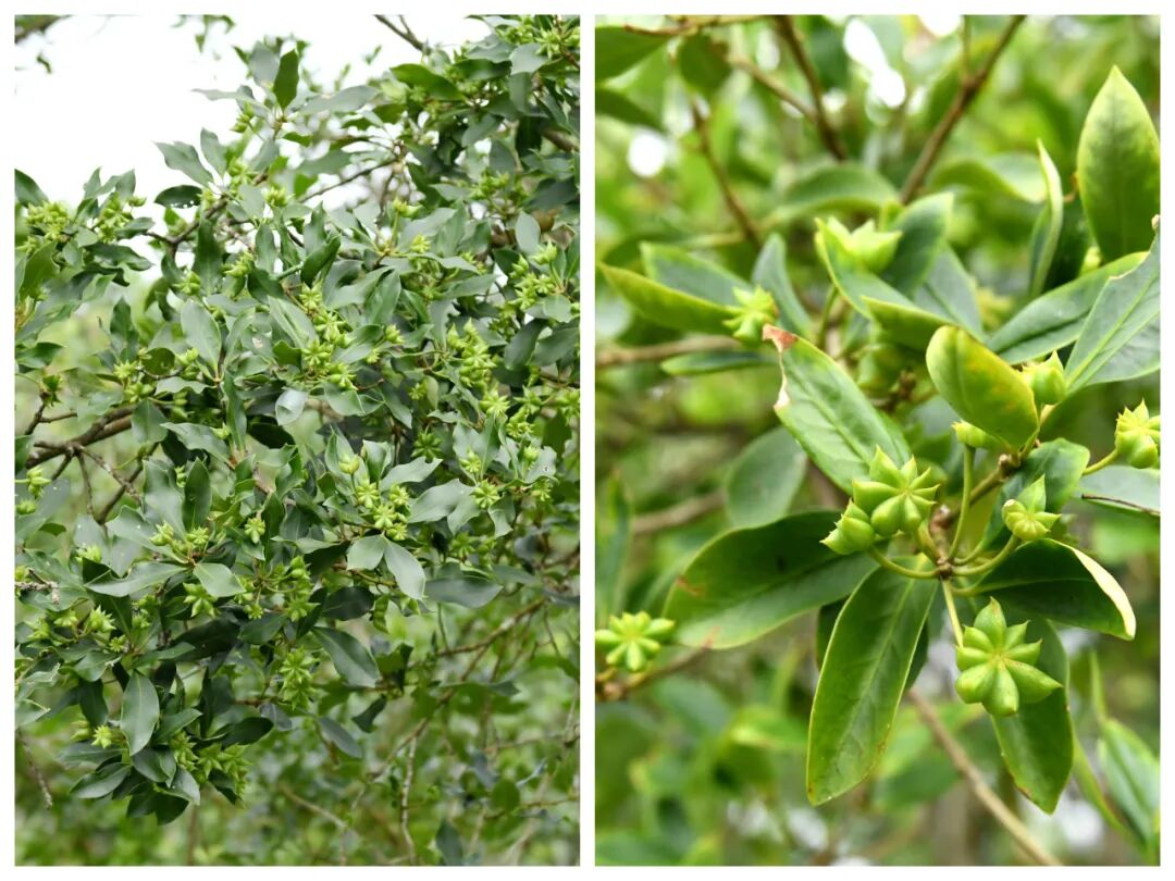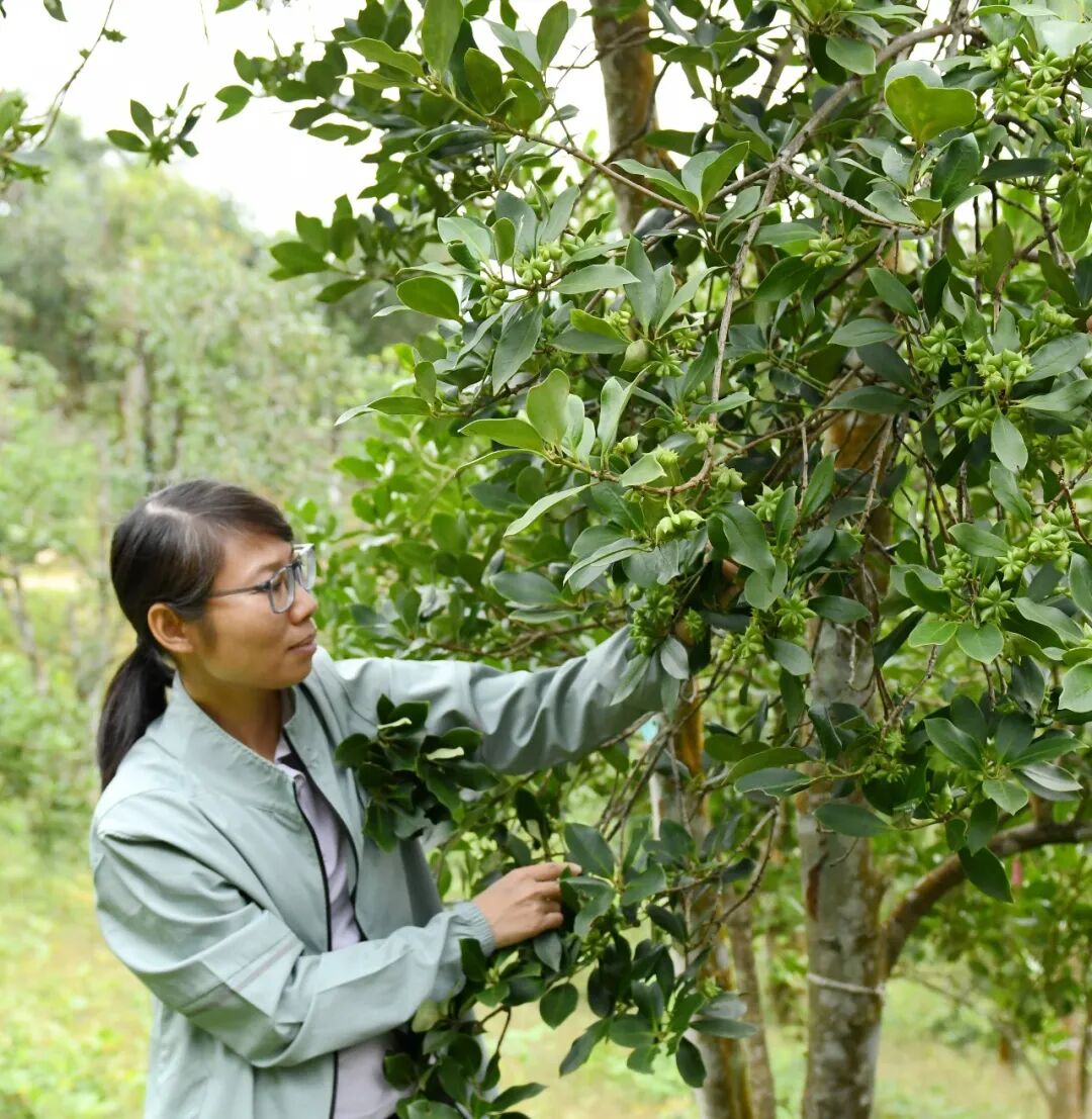 八角。梁文君 攝 “八角常年‘抱籽懷胎’,分為春果和秋果兩季采收!睆V西國有派陽山林場技術員農新一邊輕撫枝葉,一邊向記者介紹,“你看,這棵八角樹,有的果子已經成熟,再過個把月就可以采摘;而有的還在開花,要等到明年8月份左右才能采摘!彼Z氣中充滿對這片科技林場的熟悉與自豪。 寧明是“中國八角之鄉”,擁有八角林45萬畝。為推動八角產業提質增效,寧明縣積極和科研部門合作,建設八角基因庫,向科技要效益,促進八角產業發展。八角基因庫占地面積290畝,匯聚了200多個八角優良無性系品種,是全球最大的八角種質資源庫。目前,基因庫里的72個最優品種,已建成170畝標準化種子園,成為產業發展的“芯片”所在。 “基因庫的建成,徹底打破了八角產業‘靠天吃飯’的被動局面!睆V西國有派陽山林場科研中心副主任黃彩枝介紹,傳統八角樹屬常綠喬木,樹高可達25米,不僅管護困難、產量不穩,采摘過程中更是充滿風險。如今,基因庫里的八角樹經過嫁接換冠的技術,植株高度被控制在4—6米,每棵樹年產量100斤以上,畝產實現2000斤以上。
