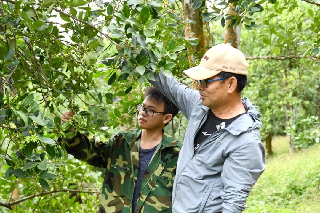 技術員在察看八角長勢情況。梁文君 攝 “為了將實驗結果做對比,我們將每個品種的八角進行部分嫁接!鞭r新指著前方兩排八角樹說道。順著他說的方向看去,只見兩排八角樹“天壤之別”,一排的八角樹,高度約13米,樹上零星結了些果實;而另一排的八角樹高度僅有5米左右,樹枝上卻掛滿沉甸甸的果實!案叩哪桥攀窃及私牵哪桥攀墙涍^嫁接換冠的。經過嫁接技術,單株產量較之前至少提升了2至3倍。”農新說。 八角種植戶李曾生正是這項技術的受益者。前年引入嫁接技術后,他家的八角林今年迎來豐產。行走在林間,他指著自家的八角林那一顆顆綠到發亮的八角果高興地說:“在技術員的指導下,我三年前嫁接了不同品種的穗條,現在整棵樹不是正在開花就是已經結果! 走進李曾生的八角林細看,記者注意到,同一棵樹上結出的八角卻不統一。有的八角有13個角,有的八角形狀如一個爪子般,有的則長得較為飽滿……然而,每棵樹都有個共同點——果實都壓滿了枝頭。 “八角對土壤、海拔高度、空氣濕度等都有要求。為了測試品類,我在一棵樹上嫁接了不同種類的穗條,從中選出最適應我家林地的八角品種,再進行大范圍的嫁接!崩钤忉尩。