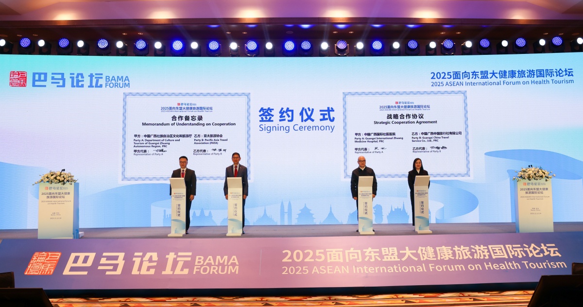 活動(dòng)現(xiàn)場(chǎng)。廣西云-廣西日?qǐng)?bào)記者 何興強(qiáng)攝 在活動(dòng)現(xiàn)場(chǎng),中國(guó)廣西壯族自治區(qū)文化和旅游廳和亞太旅游協(xié)會(huì)簽署了《合作備忘錄》,雙方從“建立常態(tài)化合作機(jī)制、聯(lián)合開(kāi)拓入境旅游市場(chǎng)、加強(qiáng)行業(yè)信息互通共享、加強(qiáng)旅游營(yíng)銷合作”等內(nèi)容展開(kāi)合作,助力廣西打造世界旅游目的地,推動(dòng)中國(guó)—東盟大健康旅游合作高質(zhì)量發(fā)展。同時(shí),中國(guó)廣西國(guó)際壯醫(yī)醫(yī)院與中國(guó)廣西中國(guó)旅行社有限公司簽訂傳統(tǒng)醫(yī)藥健康旅游融合發(fā)展戰(zhàn)略合作協(xié)議,通過(guò)“醫(yī)療康養(yǎng)+旅游體驗(yàn)”的跨界融合,讓壯瑤醫(yī)等優(yōu)質(zhì)資源轉(zhuǎn)化為可落地的旅游產(chǎn)品,為中國(guó)—東盟游客提供兼具民族特色與健康價(jià)值的文旅體驗(yàn)新選擇。