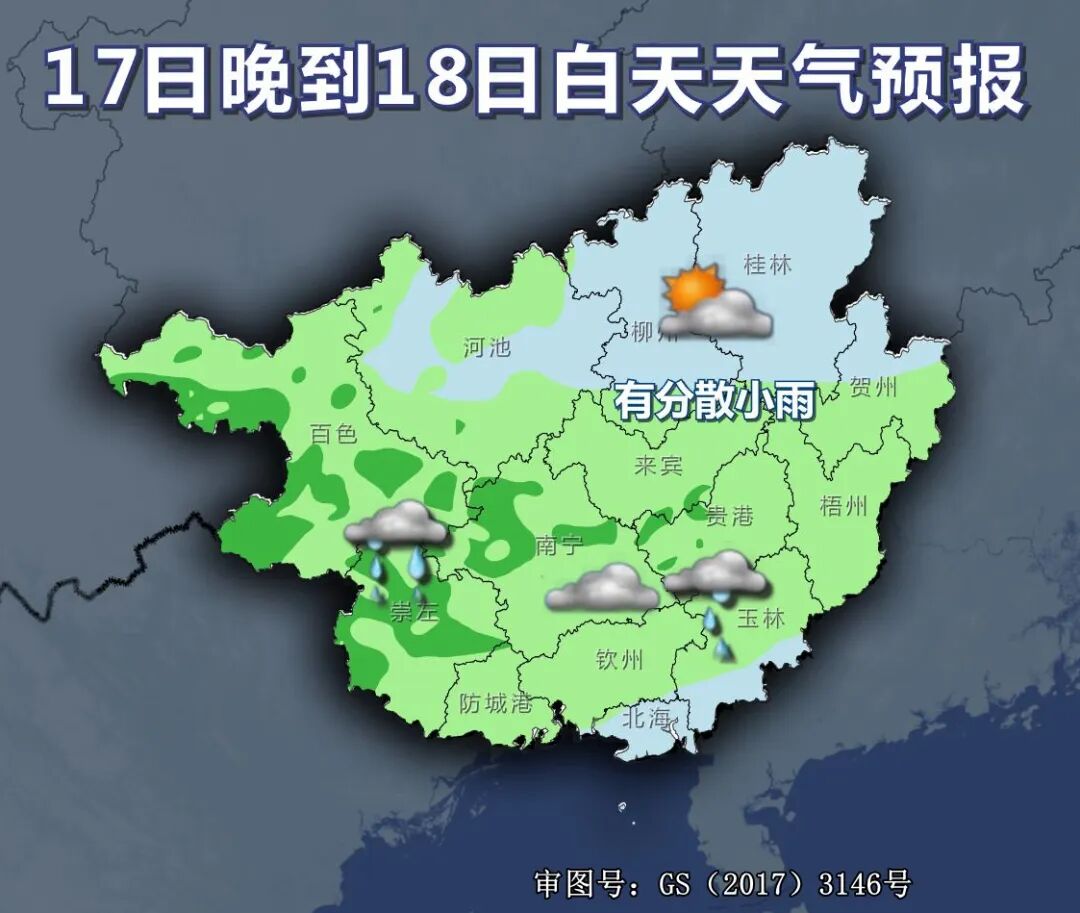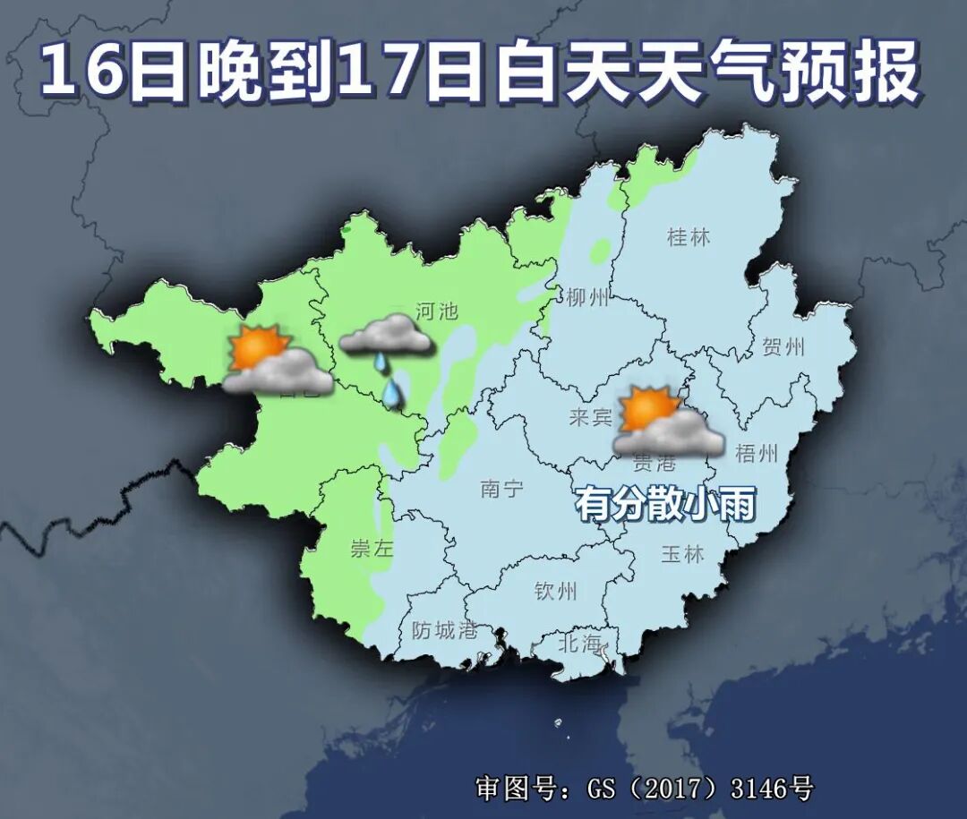 16日晚上到17日白天,桂西北多云到陰天有小雨,其它地區多云有分散小雨。桂東有5~6級、陣風7~9級偏北大風。