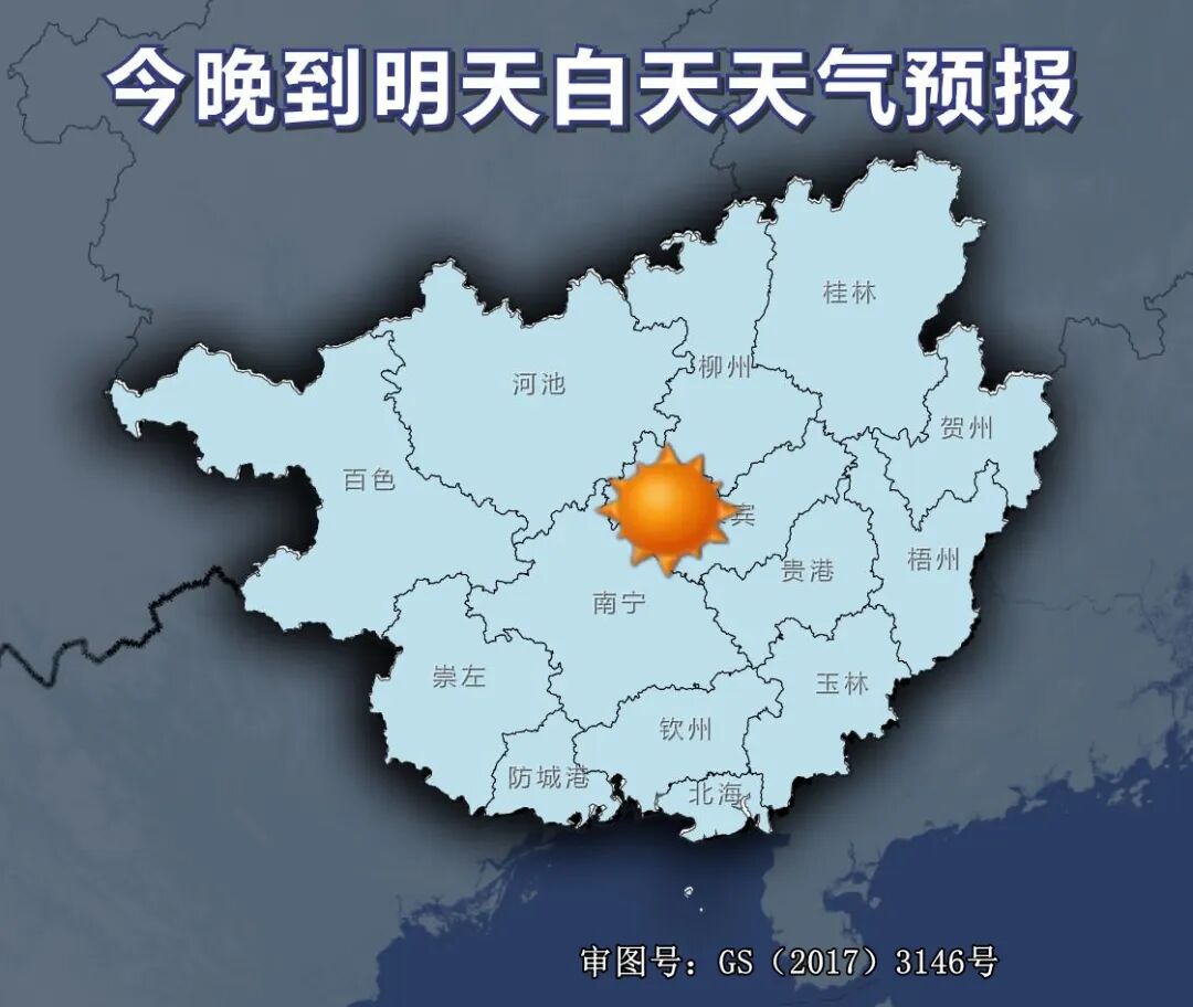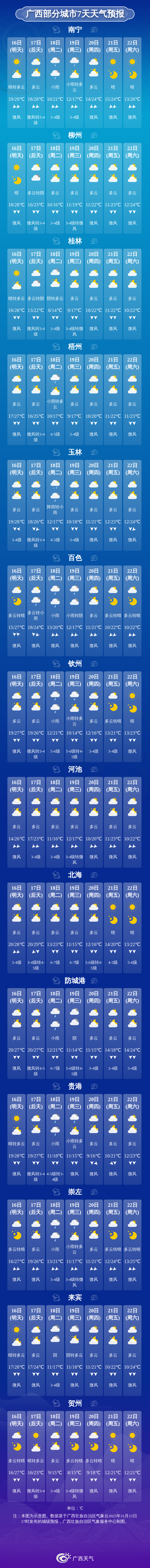 今天晚上到明天白天,全區晴到少云。 森林火險氣象等級:桂西北部分地區4級,高火險;其它地區3級,較高火險。 南寧市:今天晚上到明天白天,晴到多云,東北風2級,最低氣溫19℃,最高氣溫29℃。