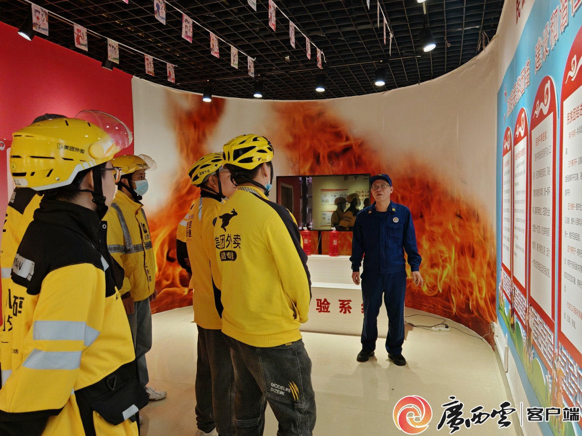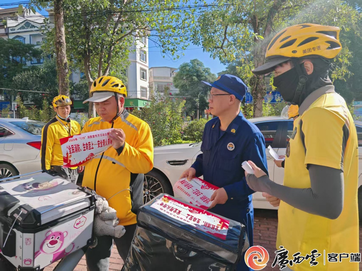 消防宣傳員向騎手們科普消防知識。 此次公益騎行活動,充分發揮了外賣騎手接觸面廣、流動性強的職業優勢,將他們轉化為消防安全的“移動宣傳員”,以更接地氣、更新穎的方式開展消防科普宣傳,積極營造“119”消防宣傳月宣傳濃厚氛圍。