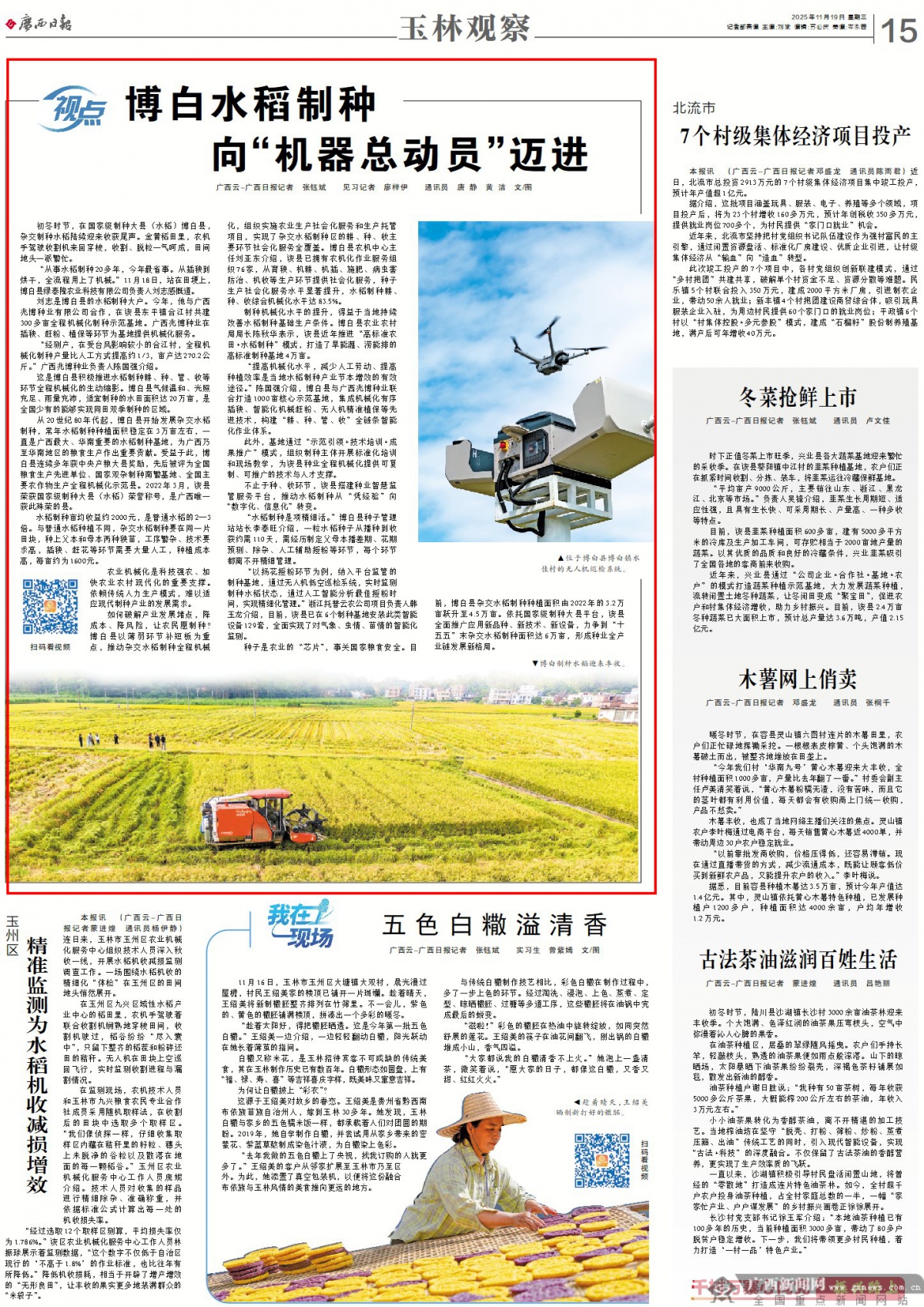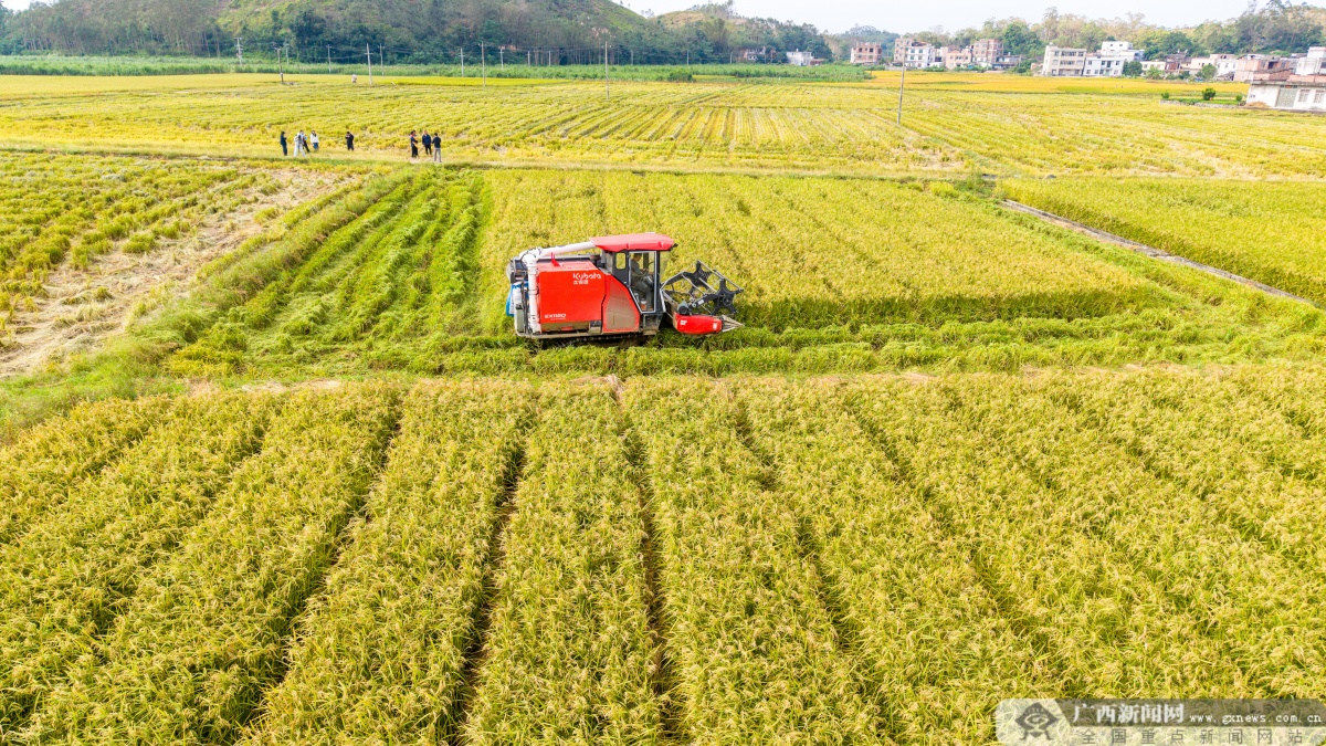 廣西日?qǐng)?bào)玉林觀察版。 視頻:記者 張鈺斌 見習(xí)記者 廖梓伊 初冬時(shí)節(jié),在國(guó)家級(jí)制種大縣(水稻)博白縣,雜交制種水稻陸續(xù)迎來(lái)收獲尾聲。金黃稻田里,農(nóng)機(jī)手駕駛收割機(jī)來(lái)回穿梭,收割、脫粒一氣呵成,田間地頭一派繁忙。 “從事水稻制種20多年,今年最省事。從插秧到烘干,全流程用上了機(jī)械。”11月18日,站在田埂上,博白縣綠泰隆農(nóng)業(yè)科技有限公司負(fù)責(zé)人劉志感慨道。 劉志是博白縣的水稻制種大戶。今年,他與廣西兆博種業(yè)有限公司合作,在該縣東平鎮(zhèn)合江村共建300多畝全程機(jī)械化制種示范基地。廣西兆博種業(yè)在插秧、趕粉、植保等環(huán)節(jié)為基地提供機(jī)械化服務(wù)。 “經(jīng)測(cè)產(chǎn),在受臺(tái)風(fēng)影響較小的合江村,全程機(jī)械化制種產(chǎn)量比人工方式提高約1/3,畝產(chǎn)達(dá)270.2公斤。”廣西兆博種業(yè)負(fù)責(zé)人陳國(guó)強(qiáng)介紹。 這是博白縣積極推進(jìn)水稻制種耕、種、管、收等環(huán)節(jié)全程機(jī)械化的生動(dòng)縮影。博白縣氣候溫和、光照充足、雨量充沛,適宜制種的水田面積達(dá)20萬(wàn)畝,是全國(guó)少有的能夠?qū)崿F(xiàn)同田雙季制種的區(qū)域。