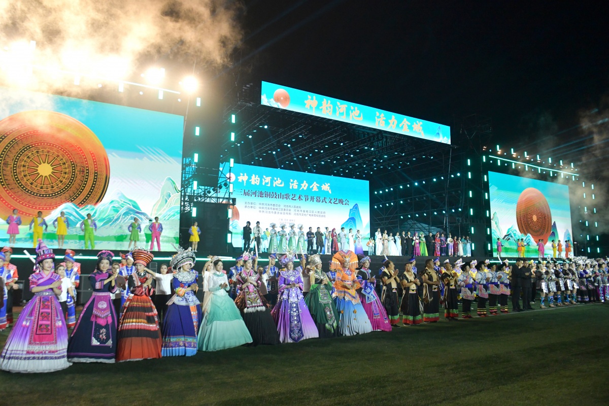 第23屆銅鼓山歌藝術(shù)節(jié)晚會現(xiàn)場。 新聞+鼓點如心跳,山歌似呼吸。一場跨越26年的文化盛宴,又回到它的最初舉辦地——河池市金城江區(qū)。 11月14日至16日,第23屆河池銅鼓山歌藝術(shù)節(jié)如期舉行。節(jié)旗再次飄揚在這片熟悉的土地上空。“神韻河池·活力金城”的主題在燈火璀璨的舞臺上盡情綻放。 河池銅鼓山歌藝術(shù)節(jié)開啟第三個輪回,標(biāo)志著一段持續(xù)守望與傳承的嶄新起點。二十六載春秋,三屆更迭,每一次輪回都鐫刻著民族文化的深沉印記。銅鼓聲依舊厚重,山歌愈發(fā)動人,而舞臺下的目光,已從一方水土望向更遼闊的世界。 這個藝術(shù)節(jié)對河池來說,超越慶典本身,是一次集體的文化覺醒。它讓河池文化在這里生長,而非陳列;傳承在這里發(fā)生,而非表演。 舞蹈《幸福的天路》。 深情回望:從起點再出發(fā) 3天節(jié)慶,銅鼓聲深沉有力,山歌悠揚動聽。 來自貴州、陜西、湖南、云南四省的優(yōu)秀代表項目,與河池13個代表團的文藝精品在此交相輝映。26臺文藝節(jié)目、16項非遺展示、94位山歌手、130件書畫攝影作品,共同編織成一幅跨越時空的文化長卷。 藝術(shù)節(jié)的再次回歸,讓72歲的韋土良感慨萬千。這位曾任縣級河池市文化局局長的老干部,親歷了首屆藝術(shù)節(jié)的全過程:“那是1999年9月25日,藝術(shù)節(jié)以桂西北各民族民間文化大巡游的形式,拉開了銅鼓山歌藝術(shù)節(jié)的序幕。” 當(dāng)年的盛況歷歷在目:全市1800多名演員匯聚金城江,用優(yōu)美的舞姿展現(xiàn)這片古老土地多姿多彩的民族文化,用豪邁的歌聲和雄壯的鼓號歡慶黨的十五屆四中全會勝利召開,慶祝中華人民共和國成立50周年,迎接澳門回歸。 那一天,銅鼓聲響徹桂西北的群山,山歌的旋律在山谷間久久回蕩。而這聲銅鼓一響就綿延26年,成為一個地區(qū)共同的文化記憶。 藝術(shù)節(jié)獨特的輪回機制——由全市11個縣(區(qū))輪流承辦,猶如一場精彩的文化接力。每個承辦地都傾注心血,將本土文化融入這場盛會。 每到一地,藝術(shù)節(jié)都給當(dāng)?shù)厝罕娏粝律羁逃∠蟆!般~鼓山歌藝術(shù)節(jié)首次來羅城,恰逢羅城成立20周年縣慶,城區(qū)變化非常大,街道鋪上了大理石,新修建了廣場。”時隔21年,縣城居民任燕對2004年舉辦的第6屆銅鼓山歌藝術(shù)節(jié)仍然記憶深刻。 歷屆晚會始終堅持思想性、民族性、藝術(shù)性的統(tǒng)一,通過現(xiàn)代包裝賦予傳統(tǒng)節(jié)目新生命,讓現(xiàn)代節(jié)目承載傳統(tǒng)底蘊。每一場演出,都是對河池各地民族文化的一次深度挖掘和創(chuàng)造性轉(zhuǎn)化。 薪火相傳:培育文化的沃土 26年間,藝術(shù)節(jié)已成為培育文化人才的豐沃土壤。一批批創(chuàng)作者、表演者在這個平臺上茁壯成長,將河池的民族文化帶向更廣闊的天地。 黃康就是其中的杰出代表。他從2000年開始參與藝術(shù)節(jié)的創(chuàng)作、排練、演出工作,并逐步成長為藝術(shù)節(jié)的總導(dǎo)演。“這個舞臺是文化人才培養(yǎng)的搖籃,為河池文化的持續(xù)繁榮奠定了堅實基礎(chǔ)。”黃康深有感觸。 在藝術(shù)節(jié)的持續(xù)帶動下,河池的文化生態(tài)煥發(fā)出勃勃生機,并日益繁榮。專業(yè)舞蹈團隊蒸蒸日上,民間藝術(shù)團體如雨后春筍般涌現(xiàn)。200多名歌王、近40名廣西舞蹈家協(xié)會會員從這個舞臺走出去。同時,藝術(shù)節(jié)還培育出一大批優(yōu)秀的編導(dǎo)、編劇。 在這些文化人才的支撐下,河池市各縣(區(qū))的文化節(jié)慶活動日益豐富:羅城仫佬族依飯節(jié)、環(huán)江毛南族分龍節(jié)、都安瑤族祝著節(jié)……呈現(xiàn)出文化百花齊放的景象。 文化的繁榮進(jìn)一步向基層延伸,各鄉(xiāng)鎮(zhèn)、村屯紛紛創(chuàng)辦了自己的文化節(jié)慶。金城江下洛扁擔(dān)文化節(jié)、六甲灶王節(jié),南丹里湖瑤族鄉(xiāng)年街節(jié),羅城龍岸侗族魚節(jié)等,這些深植于本土的節(jié)慶,成為藝術(shù)節(jié)培育出的文化新枝。 銅鼓山歌藝術(shù)節(jié)包含非物質(zhì)文化遺產(chǎn)代表性項目展演、山歌賽及歌王擂臺賽、書畫攝影展等豐富內(nèi)容,全方位展現(xiàn)河池的文化底蘊。 非遺展演《苗族銅鼓慶豐收》。 “每次籌備銅鼓山歌藝術(shù)節(jié),文藝工作者都需要提前半年開始準(zhǔn)備,他們深入各鄉(xiāng)鎮(zhèn)采風(fēng),挖掘本土文化精髓,將這些珍貴的文化元素推向舞臺,帶向更廣闊的天地。”韋土良介紹。 正是通過這些深入的挖掘工作,眾多瀕臨失傳的民族民間節(jié)目得以搶救性保護。通過系統(tǒng)性的整理,許多珍貴的非物質(zhì)文化遺產(chǎn)得到有效保護與傳承。如今,河池?fù)碛袊壹壏沁z代表性項目13項、傳承人10人,數(shù)量居廣西首位。 謝慶良、譚三剛、黎芳才、廖熙福、謝忠厚等一批傳承人正是通過藝術(shù)節(jié)的舞臺,逐步成長為國家級非遺代表性傳承人。如今,這一傳承體系日臻完善。在河池350所中小學(xué)校里,非遺課程成為學(xué)生們的必修課;125個非遺傳承場館、22個非遺工坊散布在河池的山水之間。 創(chuàng)新融合:從傳統(tǒng)向未來 藝術(shù)節(jié)對河池的影響是深遠(yuǎn)且多層次的,已經(jīng)遠(yuǎn)超文化領(lǐng)域。各承辦地以此為契機,大力推