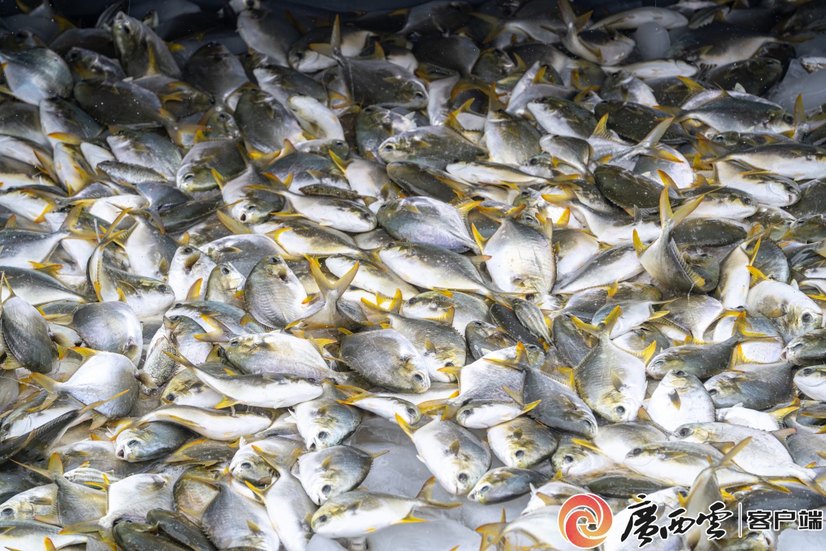 在白龍珍珠灣深水網箱養(yǎng)殖金鯧魚基地捕撈金鯧魚。記者 苑長軍 攝 截至2024年,防城區(qū)深?癸L浪金鯧魚養(yǎng)殖網箱達763口,總養(yǎng)殖水體超385萬立方米,金鯧魚年產量從2020年的1.8萬噸躍升至2.5萬噸,產值突破5.39億元,較“十三五”末實現(xiàn)產值翻倍增長。2025年,白龍珍珠灣深水網箱養(yǎng)殖金鯧魚成功入選全國海洋牧場典型案例,標志著防城區(qū)金鯧魚養(yǎng)殖技術與規(guī)模躋身全國先進行列。 品牌賦能讓“好魚”賣出“好價錢”。“十四五”期間,防城區(qū)著力打響“防城港金鯧魚”區(qū)域公共品牌,成功獲得農產品地理標志認證,培育“江山漁夫”“深海金鯧魚”等特色商標,3個產品通過“三品一標”認證。鎖鮮冷凍金鯧魚通過全程冷鏈物流銷往武漢、南京等全國各大城市,標志著防城區(qū)金鯧魚產業(yè)正從傳統(tǒng)養(yǎng)殖向覆蓋“養(yǎng)殖、生產、加工、流通、銷售”的全產業(yè)鏈協(xié)同發(fā)展模式轉型升級。