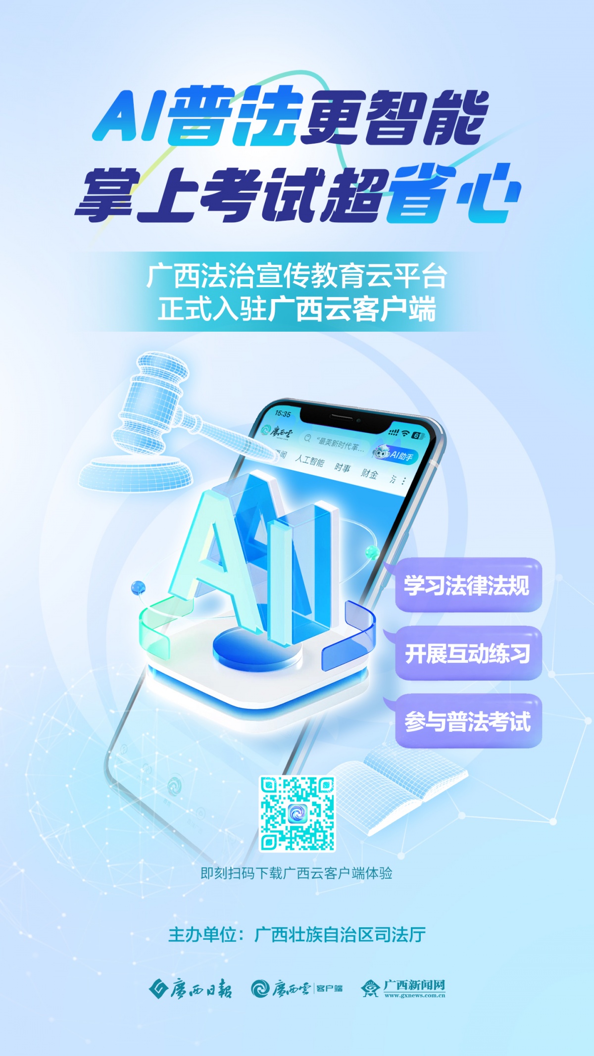 AI普法更智能 掌上考試超省心 近日,廣西法治宣傳教育云平臺 完成煥新升級 正式入駐廣西云客戶端啦! 今后登錄廣西云客戶端,就可以—— 學(xué)習(xí)法律法規(guī) 開展互動練習(xí) 參與普法考試 智慧普法一觸即達(dá)!