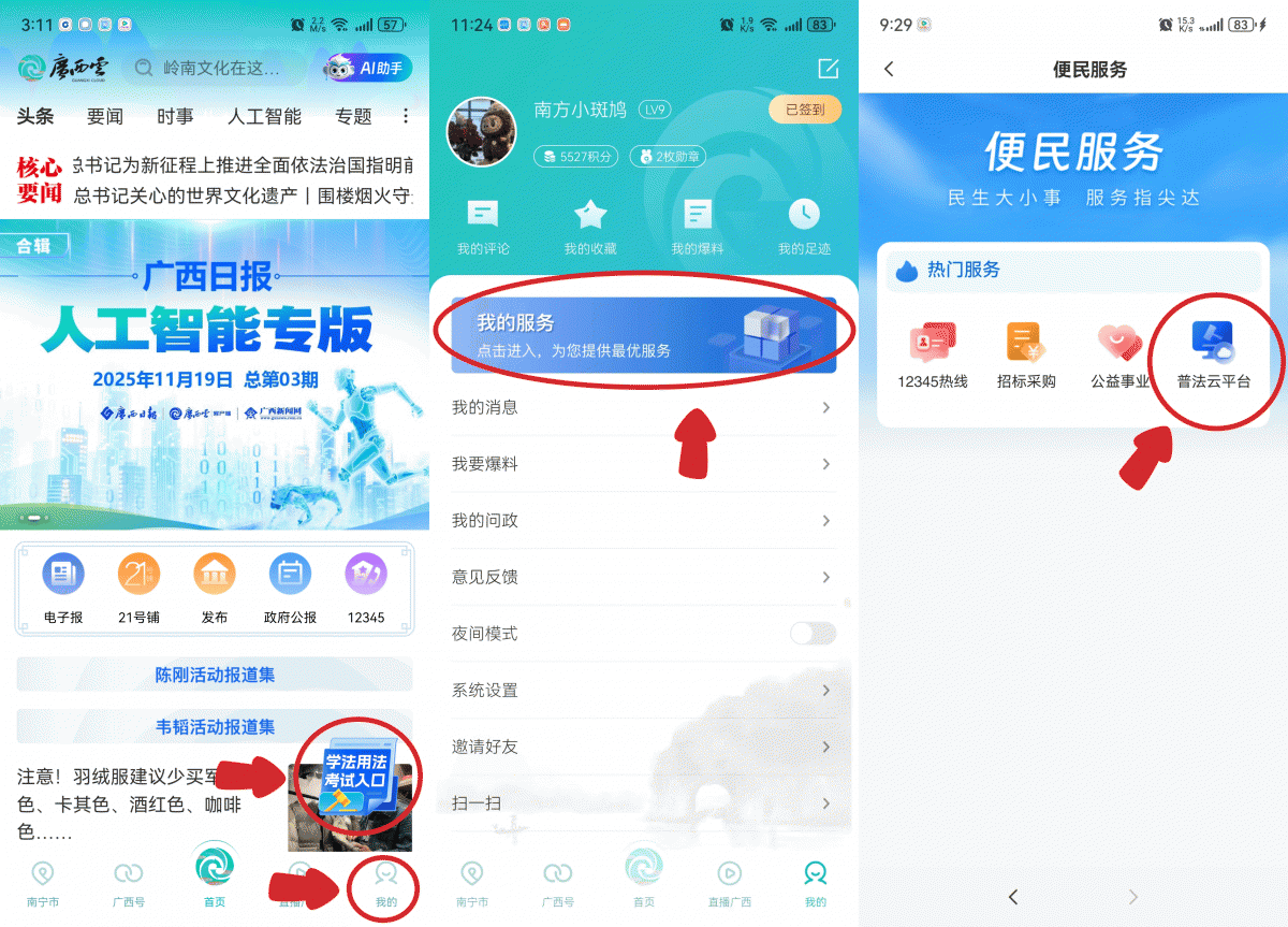 第2步:進(jìn)入頭條>學(xué)法用法考試入口>普法云平臺 或點擊我的>我的服務(wù)>普法云平臺