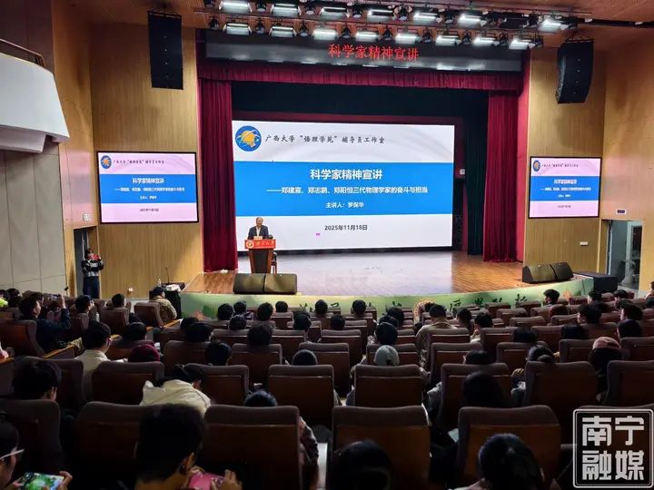 11月18日,廣西科學家精神宣講團成員羅保華走進廣西大學,為近300名學子帶來主題為“崇尚科學,物求真理——鄭建宣、鄭志鵬、鄭陽恒三代物理學家的奮斗與擔當”的宣講會。