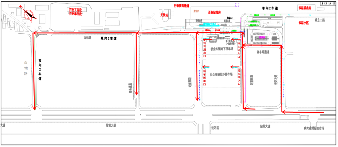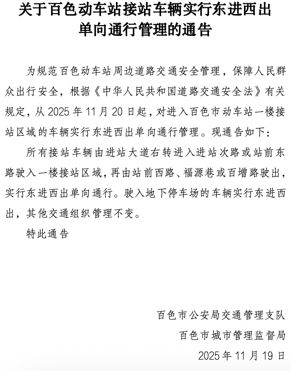 11月19日,百色市公安局交通管理支隊聯合百色市城市管理監督局發布通告,為進一步優化動車站周邊道路交通組織,保障市民及旅客出行安全高效,從11月20日起,對百色站一樓接站區域車輛實行“東進西出”單向通行管理。
